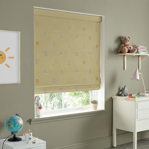 Perfect for children's rooms or nurseries, this adorable roman blind features Sophie's Bears & Balloons design, which is covered in safari animals with cute giraffes, lions, zebras and teddy bears on a soft mustard ground. Perfect for blocking the light when they go down for a daytime nap or evening snooze.